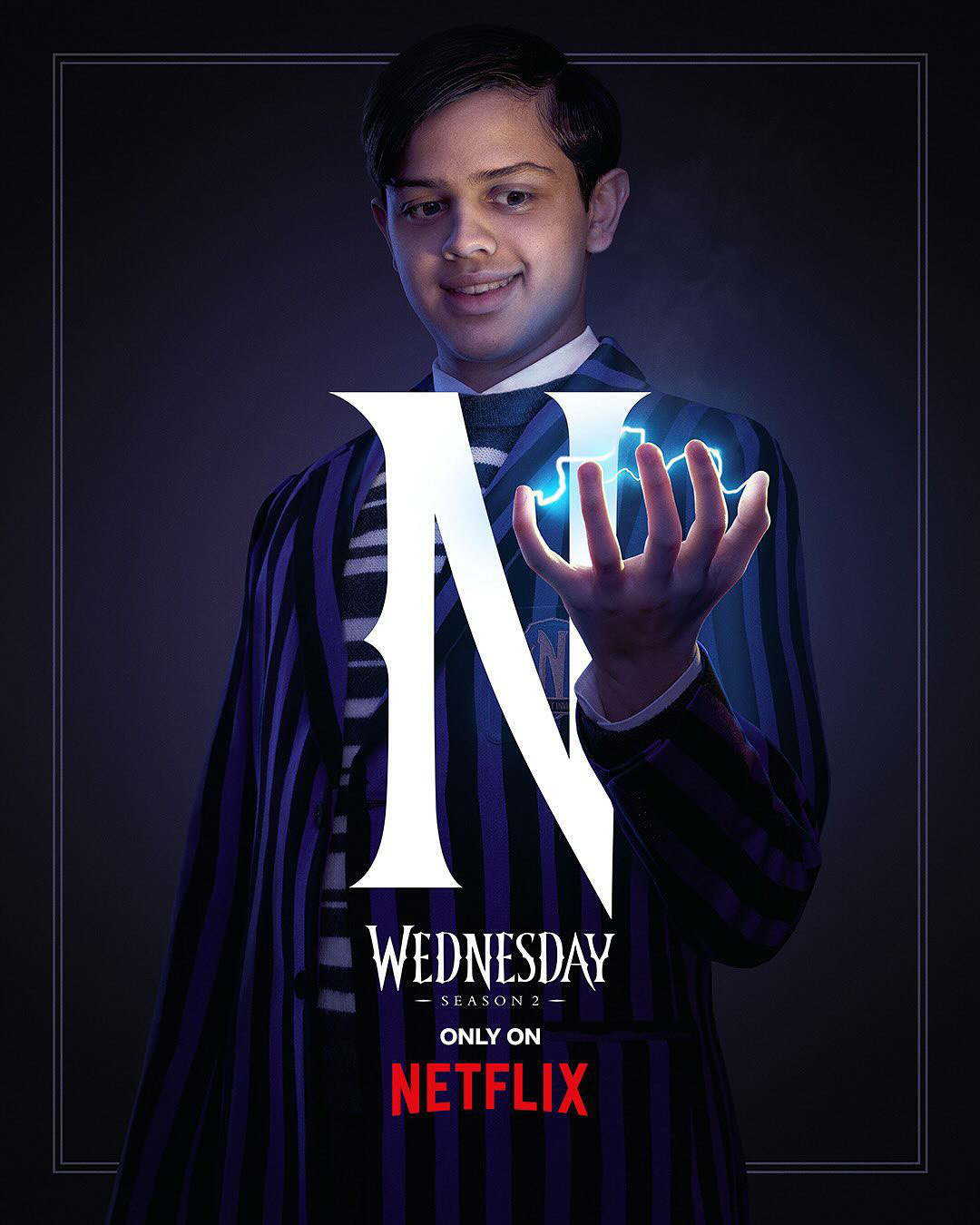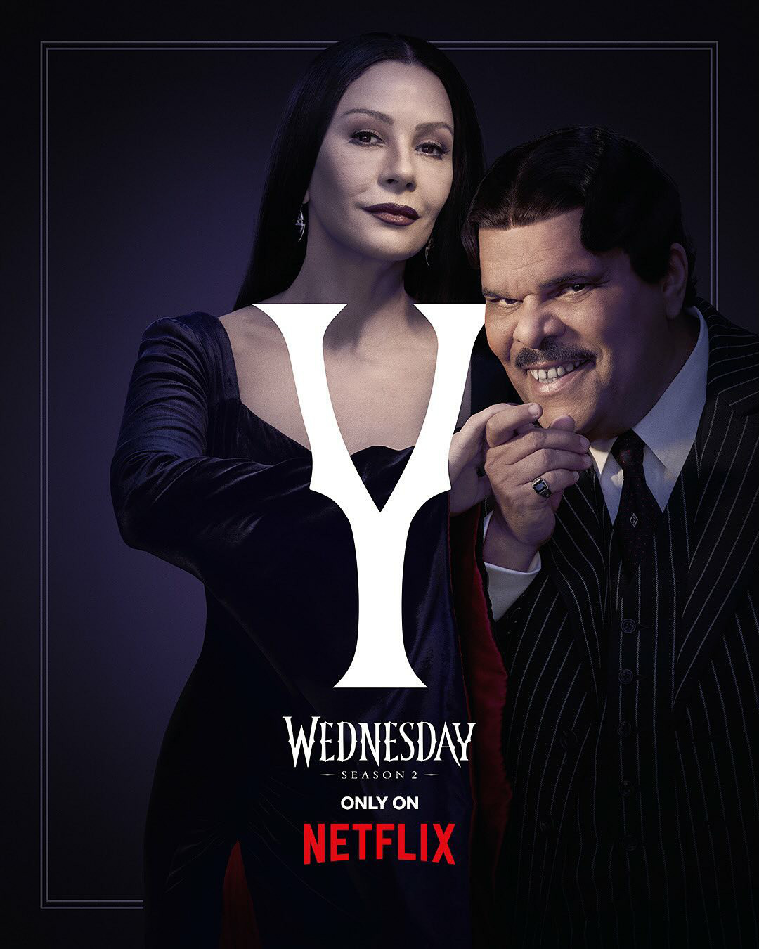 1905电影网讯 6月12日,Netflix系列剧集《星期三2》(Wednesday 2)发布十大角色海报。海报中,除了依然狂秀恩爱的亚当斯夫妇同框现身,主角星期三、狼女依妮、海妖比安卡、弟弟帕斯利、马蜂社社长尤金、上一季的真凶泰勒、蛇怪阿贾克斯,还有THing悉数回归。一同登场的还有手指会冒火的新校长巴里·多特,暗黑故事即将回归。